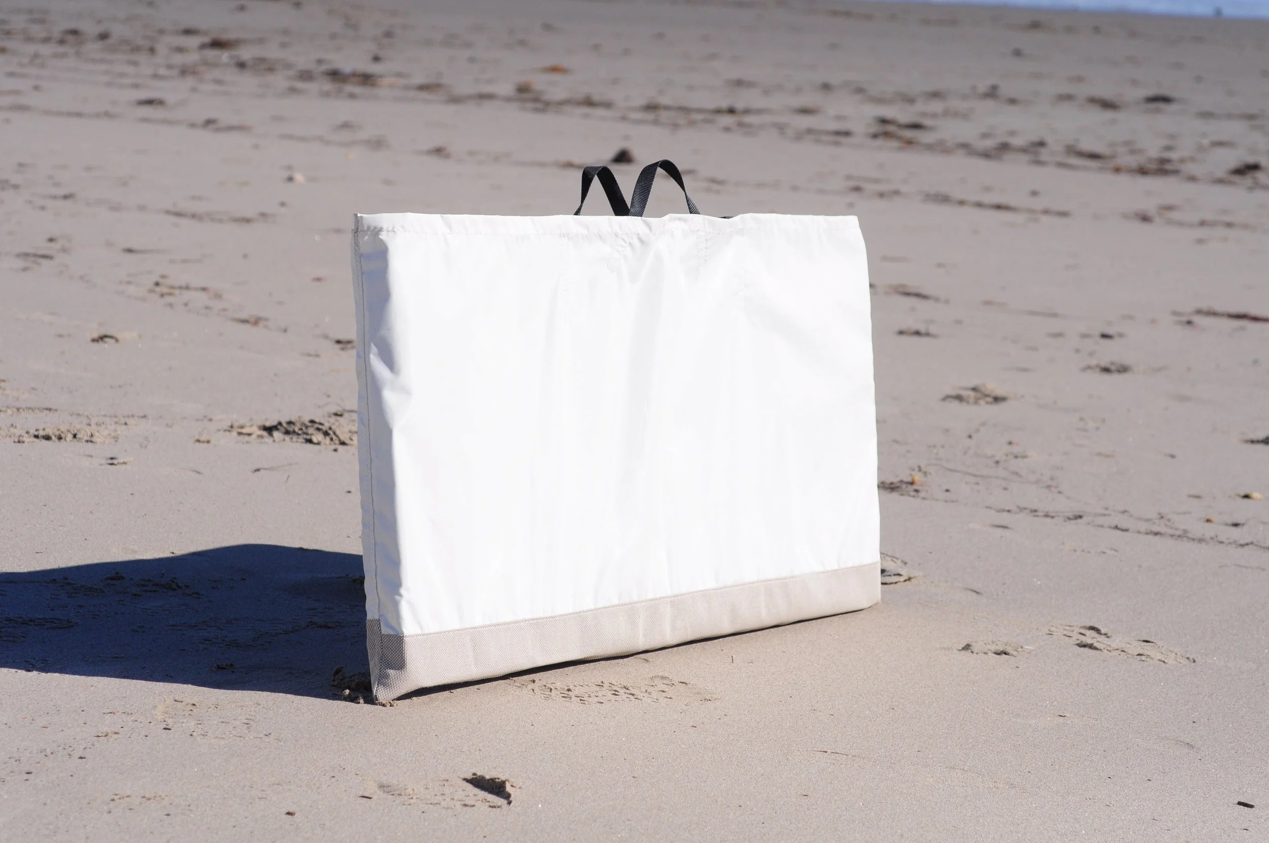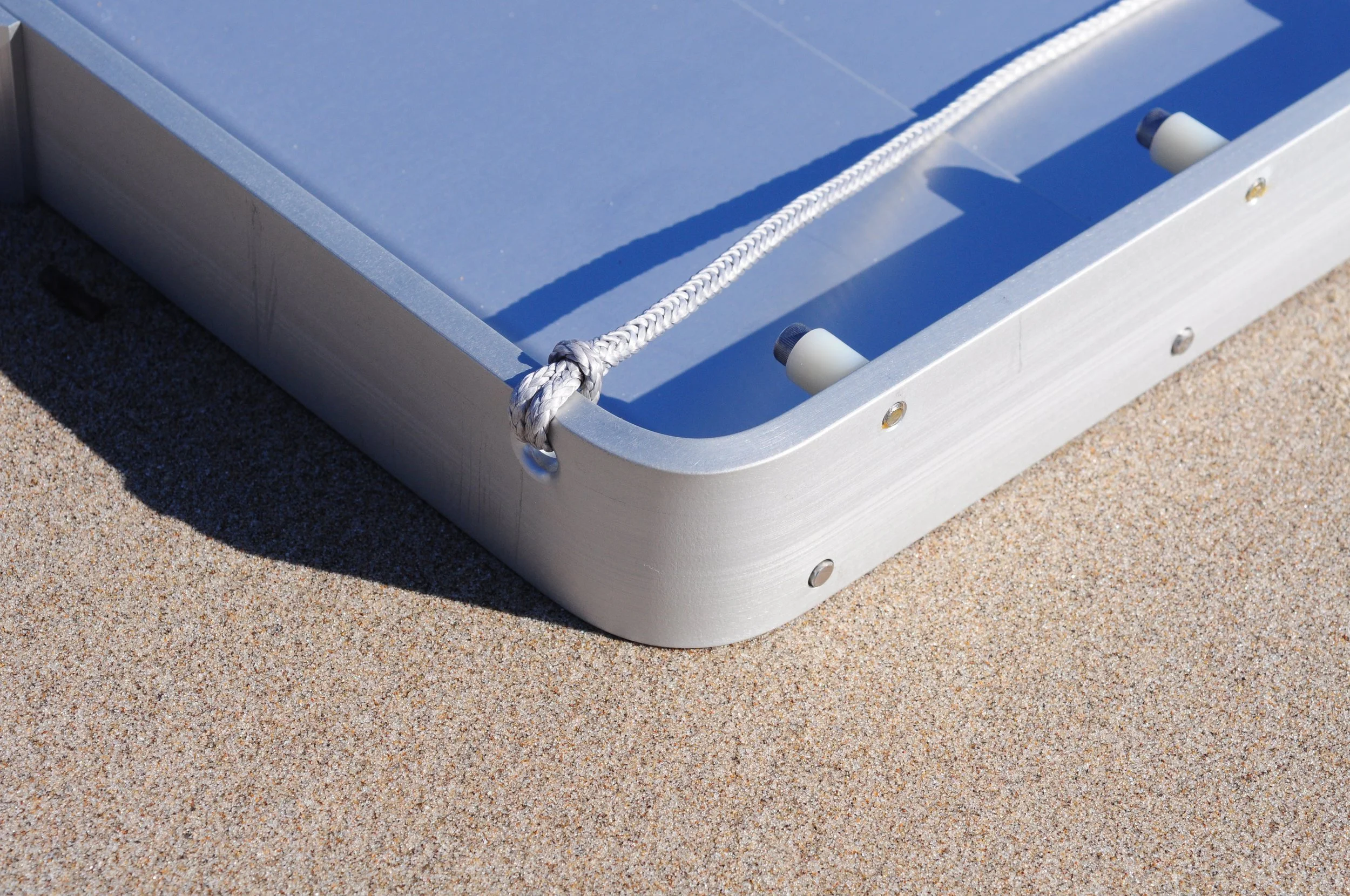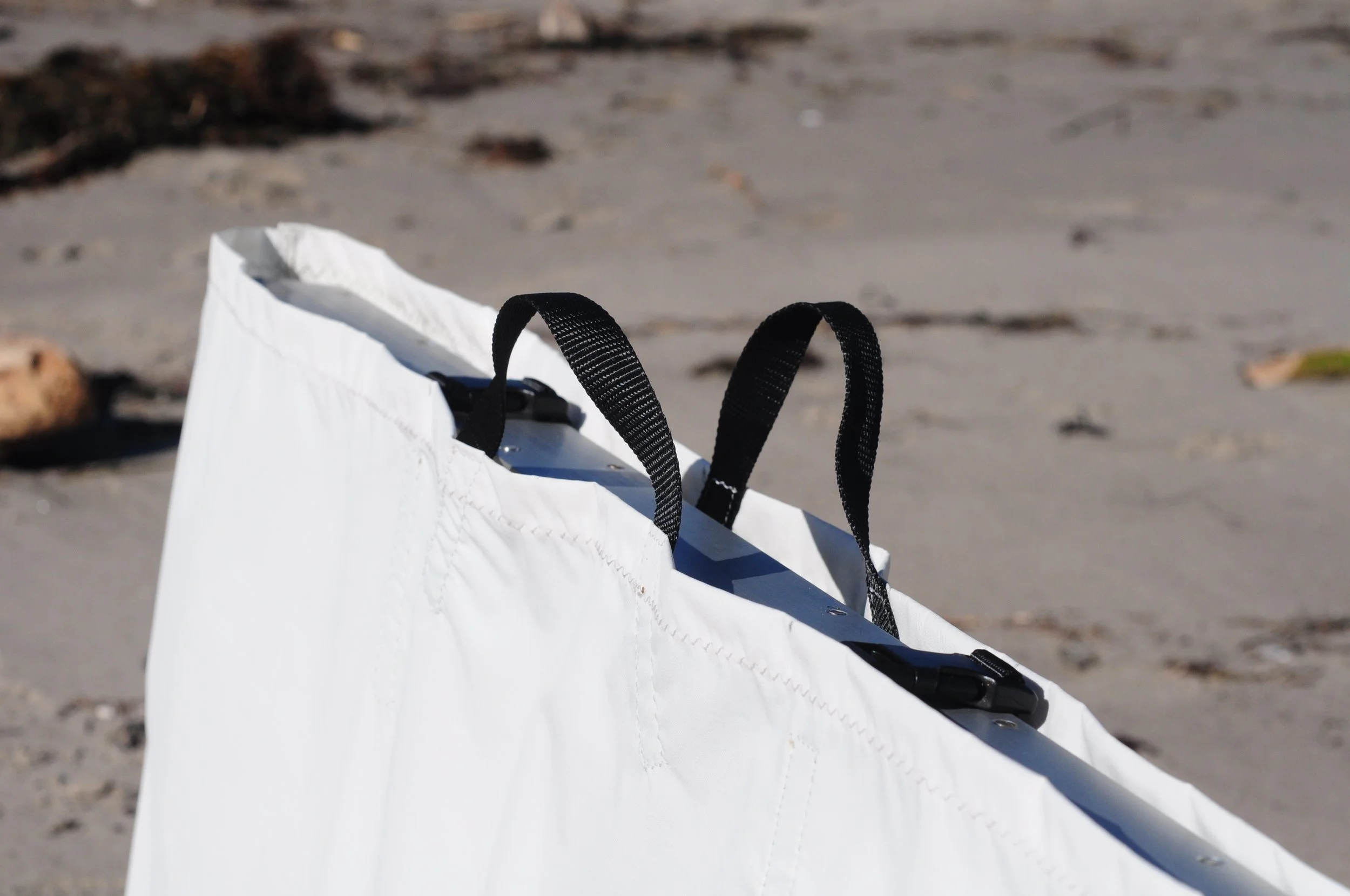 Cases are available making moving and storage a breeze. A thick mesh bottom allows for drainage so the Rock Stopper can be rinsed off in the case. An open top with buckles allows good ventilation to to allow drying. Great for carrying dive gear or as a beach bag while the Rock Stopper is in use. The material is Serge Ferrari with a polyester weave and PVC coating. The durability and UV resistance is far beyond canvases like Sunbrella. The sides are made of 9oz Stamoid Light and the bottom is 17oz Batyline Duo which does a great job protecting decks.