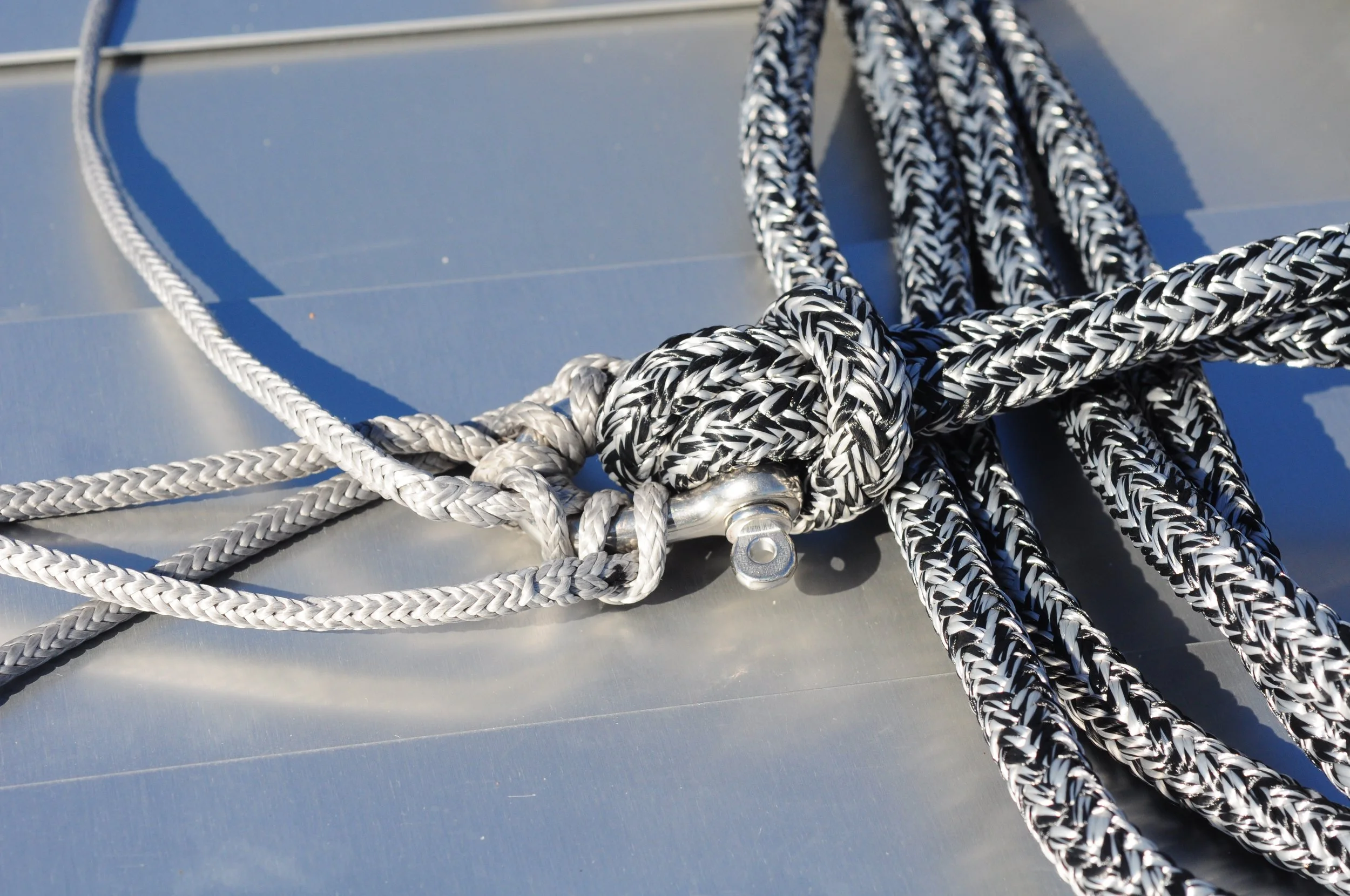Splices are brummel locked and looped for chafe protection. The shackles are torqued to spec with removable locktite, they will not come out unless opened with a tool and do not need locking wire. Small diameter dyneema bridles allow the panel to sink quickly.